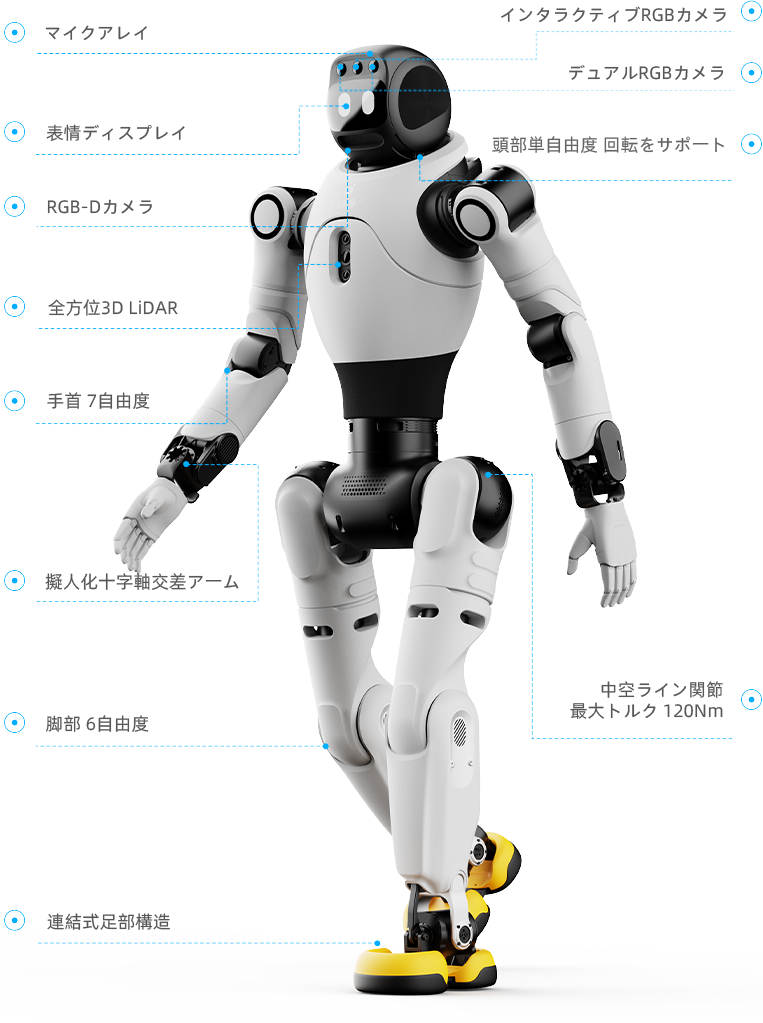 25〜30の自由度を有し、頭部1自由度、腰部3自由度を含む。多彩で柔軟な動作により、生き生きとした表現を実現。